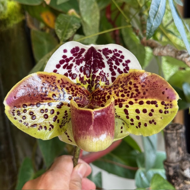 セレクト個体を入手して2度目の開花です。株の出来は良くありませんが、2度とも花粉は良い状態です。昨年は激しく点の入る花に交配しました。ドーサルがカップになって小さめなのが短所ですから、ドーサルがフラットで面積の広いUnryuなどが良い相手になりそうです。木を充実させることが良い苗を得るには必要ですから数年作り込んで実現しようと思います。
